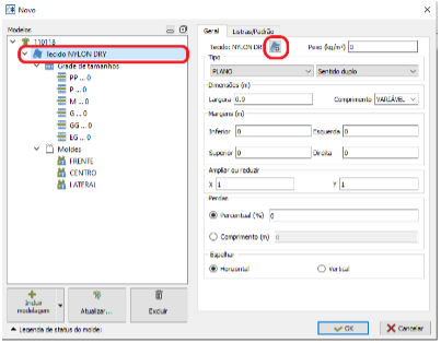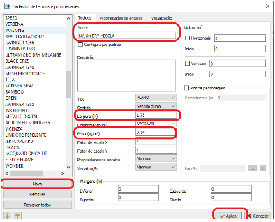 - Caso não tenha o tecido cadastrado, clicar em “NOVO”, preencher os campos “NOME”, “LARGURA” e “GRAMATURA” e clicar em “APLICAR”.