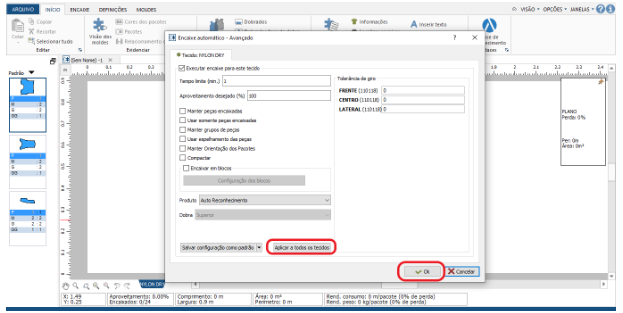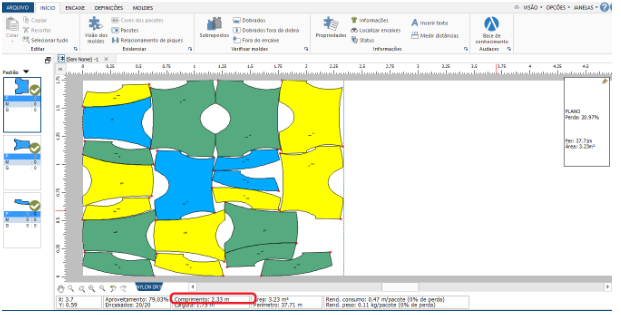 Após o software rodar por alguns minutos, apresentará o aproveitamento, quantidade de moldes encaixados e o comprimento do enfesto. Para determinar o consumo utiliza-se o comprimento do enfesto.