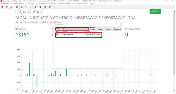 Clique em pesquisar e digite 3020 para encontrar a tela de movimentação e em seguida clique duas vezes no resultado da pesquisa.