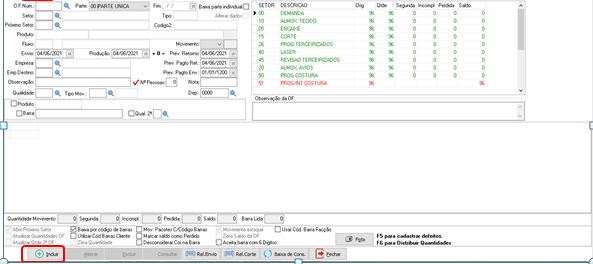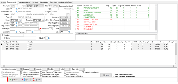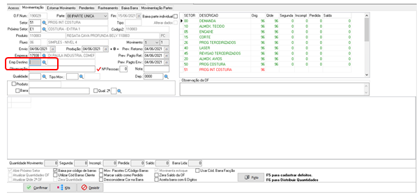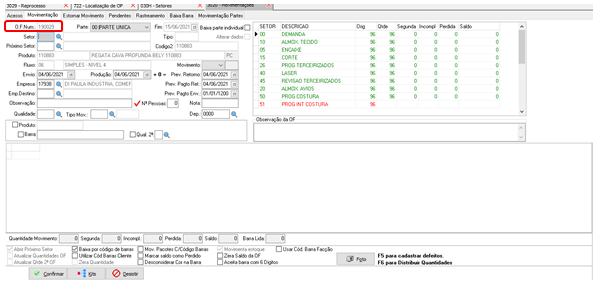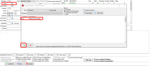 Após selecionar a OP clique na lupinha do lado do campo SETOR e em seguida selecione o setor que deseja movimentar e clique na setinha verde. Aperte em ENTER no teclado.